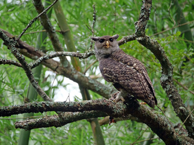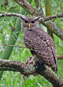 But there is one member that has always fascinated me more than any other bird in the subcontinent. This is the largest of the Indian owls, the spot-bellied or the forest eagle owl. One can assume that its large size should make it easy to see. But there are a few behavioral traits that negate this idea – its adherence to dense forest patches, the habit of constantly switching day roosts and the biggest issue of all, its preference of sticking to the high canopy. We have seen this owl in past in the sal forests of Kanha and the evergreen patches of the north-east. From whatever records we have seen and heard of, this is the top avian predator of the night. These large owls have been recorded bringing down peacocks, flying squirrels, fruit bats, deer fawn, drongos and pretty much anything else they can get their talons on.