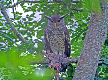 We reached the stream, us on one side with our binoculars, scopes and cameras on one side and our neighbor on the other, pointing out where the owl was. We moved to a ideal spot from where we had a very good view of the owl and the Malabar grey hornbill that were mobbing it. From our Swarovski ATX 95 scope we could get clear view of its intricately patterned plumage, the heart spotted undersides, the shade less dark eyes and the long ear tufts. The mangled carcass of an adult grey jungle fowl dangled from its talons as it chased the mobbing birds away with wing flaps and open mouth threats. This drama continued for a good hour before the owl managed to establish its dominance and start feeding. It was the moment we were waiting for. The top owl of the night which had eluded us for months, was now sitting out in the open in broad daylight with a kill.