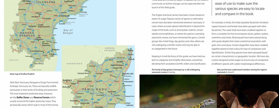The last hurdle was more about the taxonomic arrangement of species and groups with complex identification keys. Despite the fact that we often came across Caecilians in our field visits, we never bothered identifying them because of a mix of laziness on our part and the complexity involved. We literally had to learn about these species, key out our images and lay out the pages on these limbless amphibians in as simple a way as possible. Identification of species groups like Indirana sp. frogs, Hemidactylus sp. and Cnemaspis sp. geckos and even some warblers were beyond the scope of the book in terms of the language we used in lieu of keeping it simple and the limitations brought about by a photographic guide book. We could not use terms like pre-cloacal femoral pores or talk about lengths of digits in frogs when we talk about species identification. This was a major challenge and something we think we addressed using a mixture of disclaimers, in-depth introductions to such complex groups and most importantly, splitting them based on distribution and visible external characters to at least help the enthusiast indicate and narrow down species.